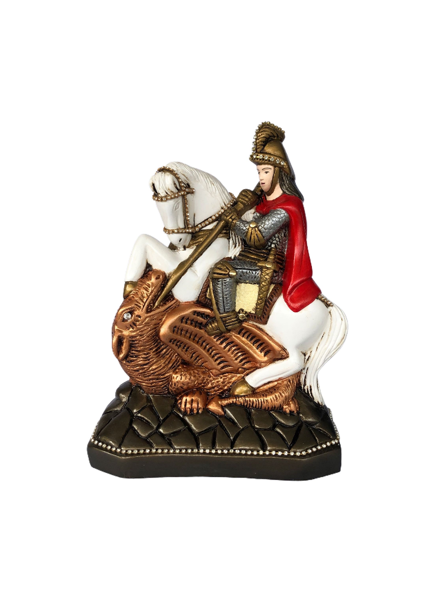 Imagem de São Jorge produzida artesanalmente pelo Ateliê Maria Neri com estrutura em gesso maciço e finamente decorada. Excelente para reavivar a fé ou presentear quem você ama.